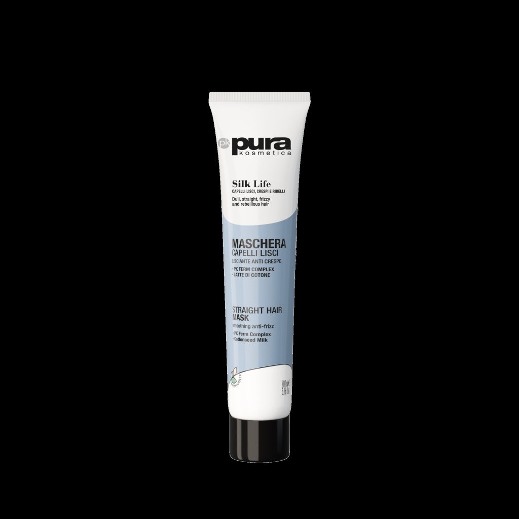 PURA KOSMETICA Silk Life uhlazující maska je profesionální vlasová maska navržená pro intenzivní uhlazení, výživu a zvýšení lesku vlasů, které potřebují profesionální úroveň péče bez zatížení. Formule je vytvořena tak, aby pomáhala zlepšit texturu vlasů, redukovat krepatění a zároveň zanechávala vlasy hladké, lesklé a snadno upravitelné.